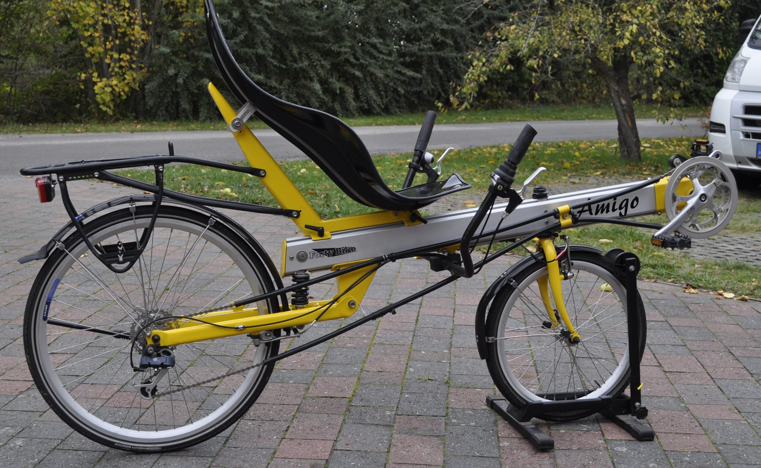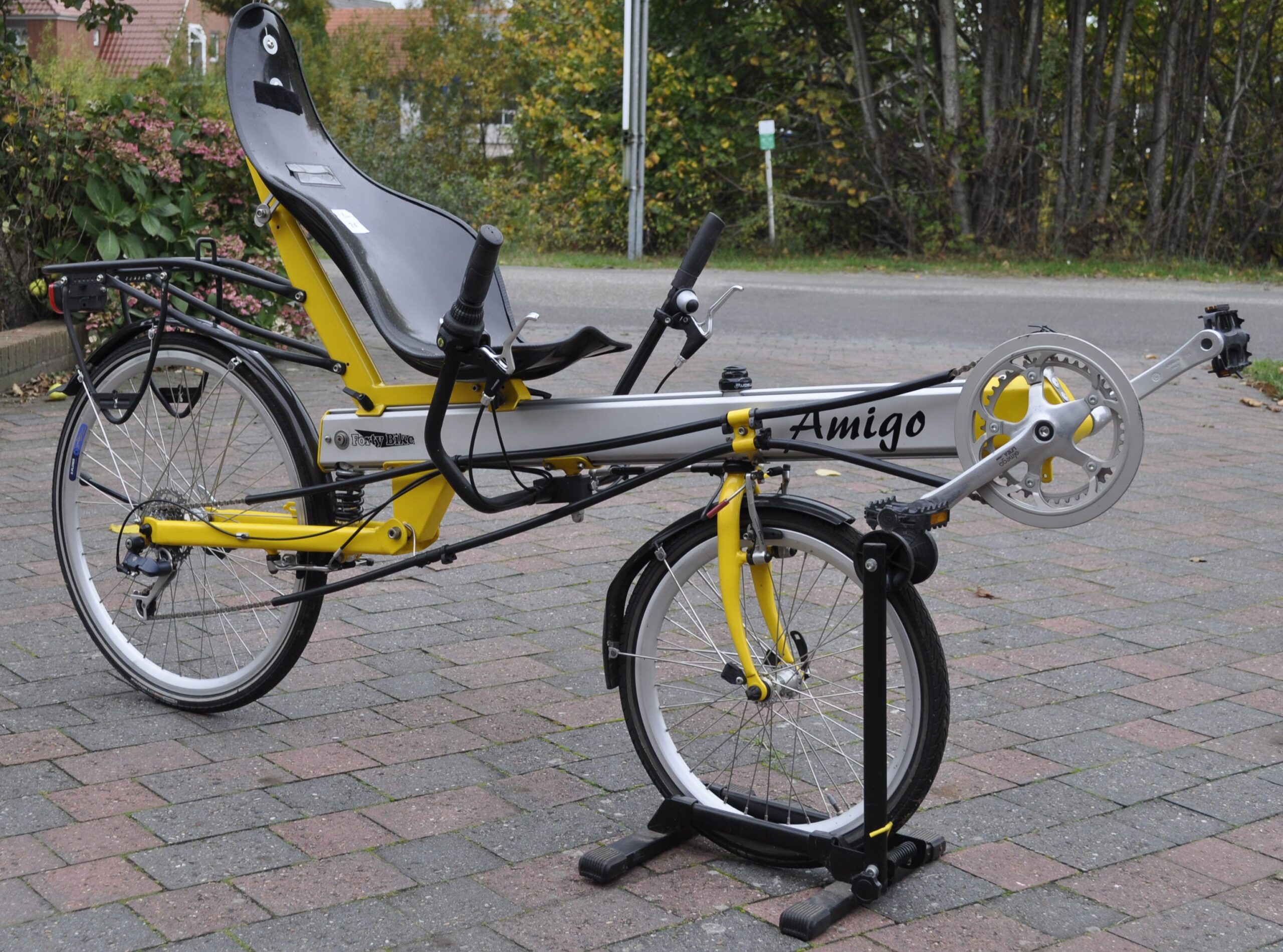 Es ist eine Weiterentwicklung des Amigo von Flevobike und hat ein ungefedertes 20 Zoll Vorderrad und ein gefedertes 26 Zoll Hinterrad.