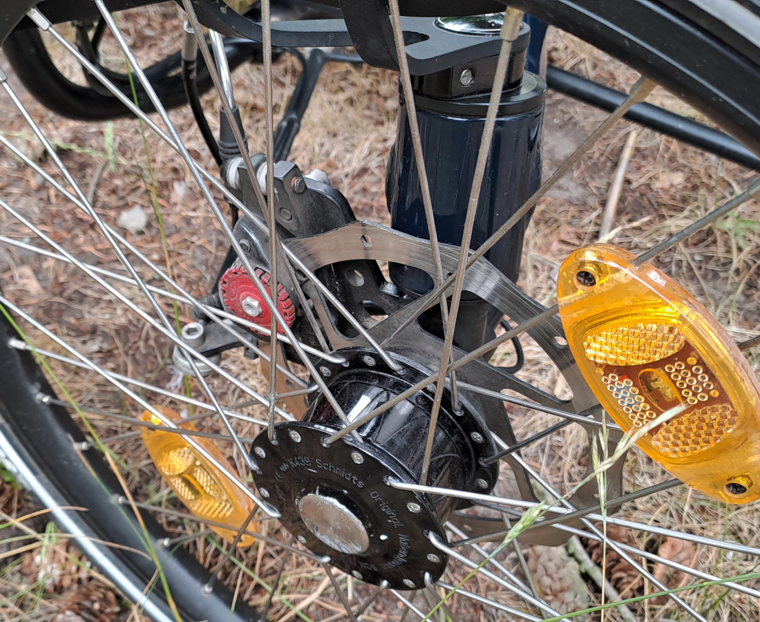 Ich habe zusätzlich weiß- bzw. rotreflektierende Folien an den Click-Pedalen und dem Bodylinksitz angebracht. Fürs Parken (immer) im Keller habe ich mir einen rollbaren Holzständer gebaut, in dem das Rad senkrecht (Sitz oben, Kurbel unten) gelagert wird. Den gebe ich dazu (die Anhängerkupplung aber nicht).